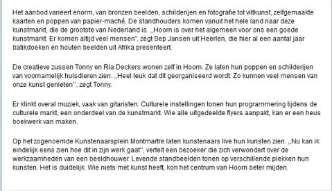 Ook dit jaar stonden wij weer met ons werk op de grootste kunstmarkt van Nederland!Op zondag 6 september 2015 werd voor de 11e maal de grootste kunstmarkt van Nederland gehouden die zich als een lint door de historische Hoornse binnenstad slingert.De meer dan 200 kramen trokken tienduizenden bezoekers uit alle delen van het land.Kunst werd ter plekke gemaakt op het kunstplein op het dal, dat voor de gelegenheid was omgedoopt tot ‘Montmartre’.VolgendeTerug